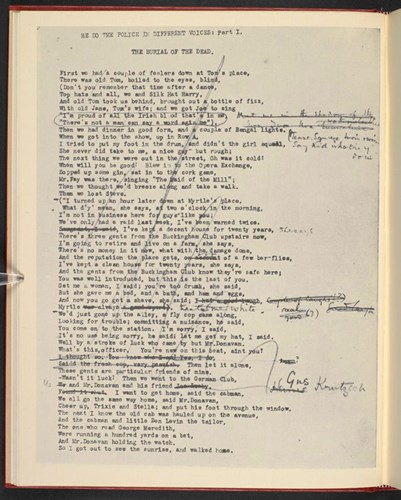 El maquinuscrito original de The Waste Land, todavía con el título de He Do the Police in Different Voices, con las correcciones de Ezra Pound. Fotografía de la Colección de Literatura Inglesa y Norteamericana de Henry W. y Albert A. Berg. Biblioteca Pública de Nueva York.